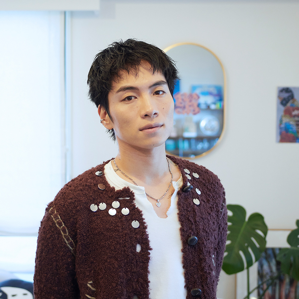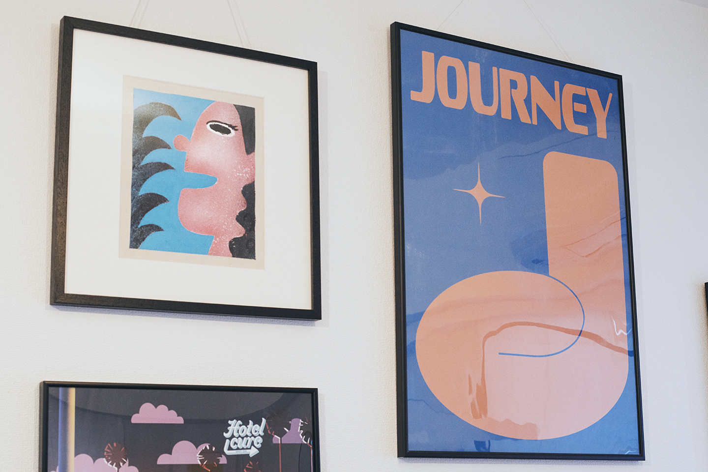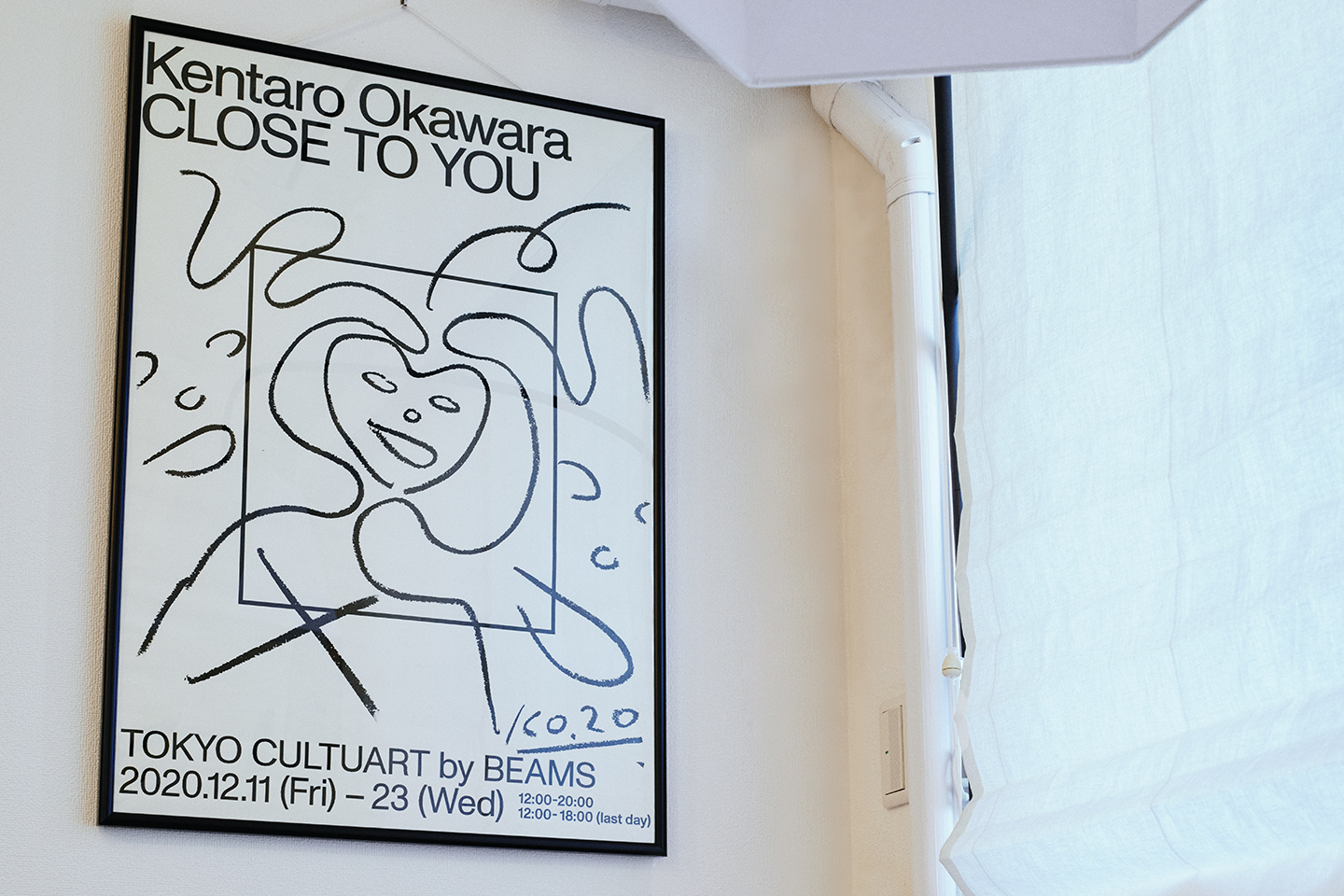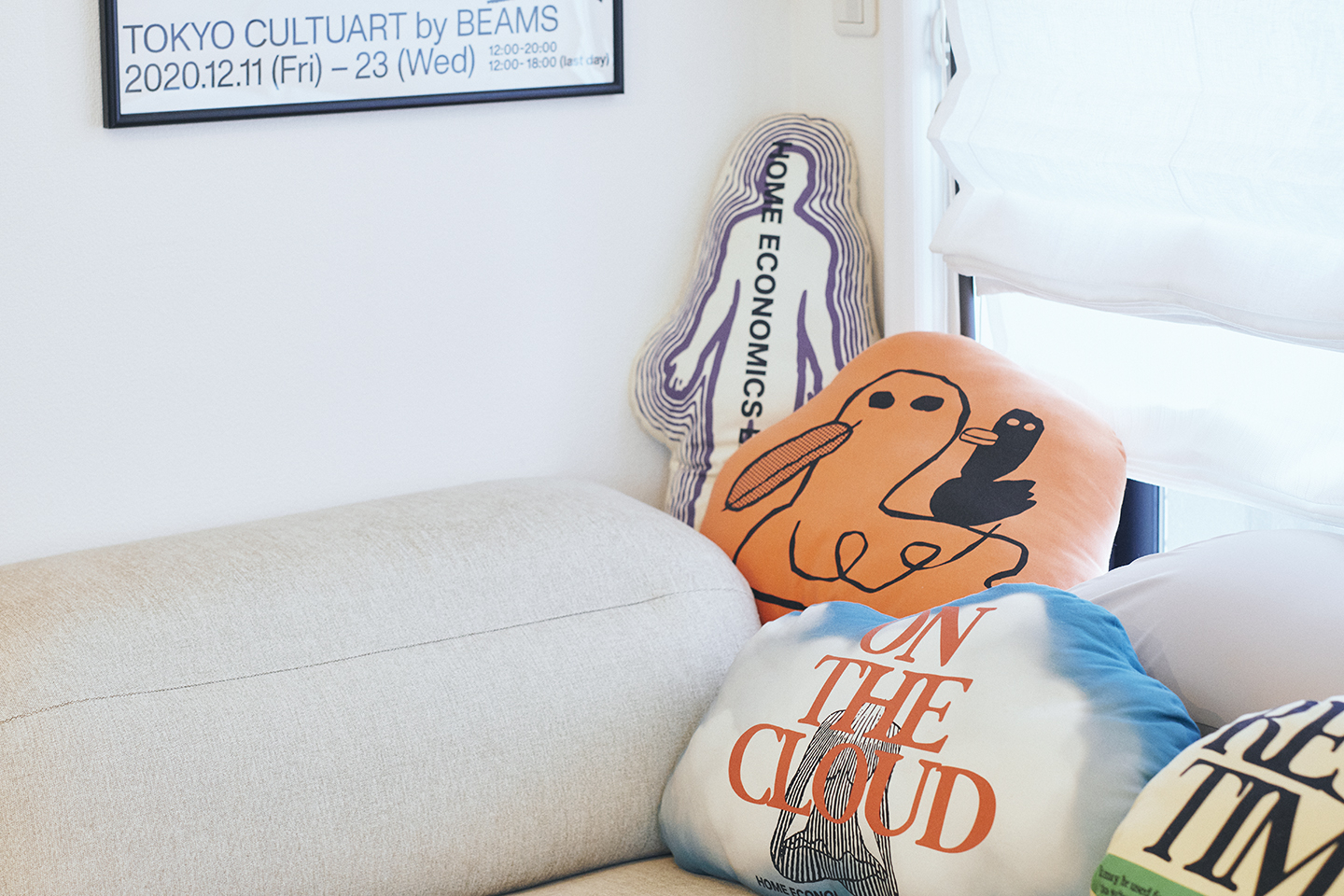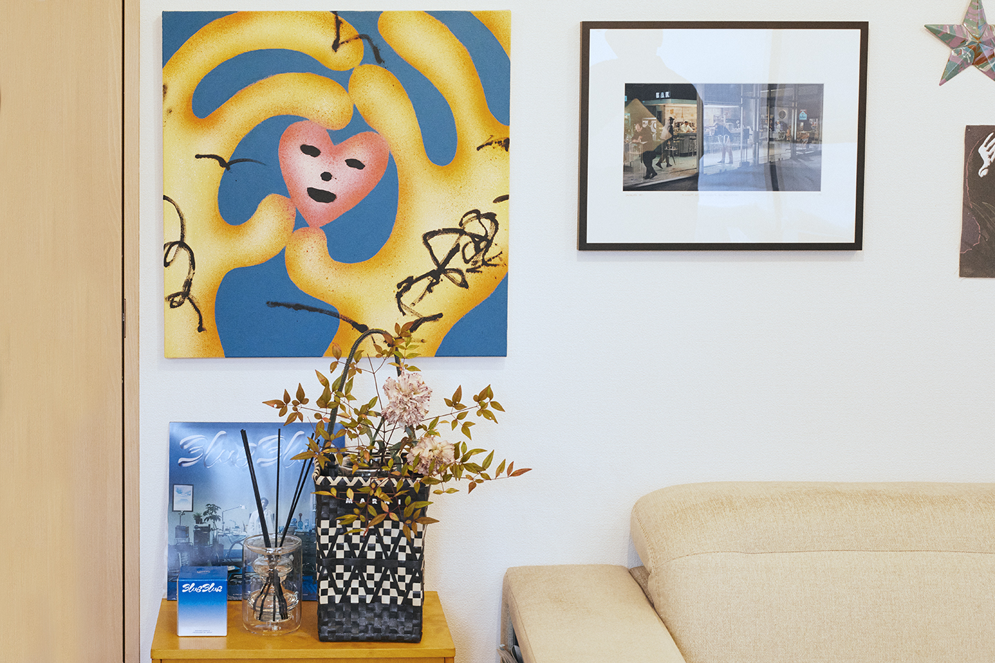 今は韓国を中心に活動するKenちゃんは、クッションの展示やブランドとのコラボ、好きな居酒屋のコンセプトデザインをしたりしていて、彼の多岐に渡るお仕事が自分の刺激になっています。僕のアーティスト写真を撮ってくれている小見山峻(以下、こみしゅん)は、お互いアウトプットの方法は違うけれど、社会や業界に対して思うことや作品への熱量などが似ているなとよく感じますね。そんなふうに信頼できる仲間のアートを飾ると、心の安心につながるんです。